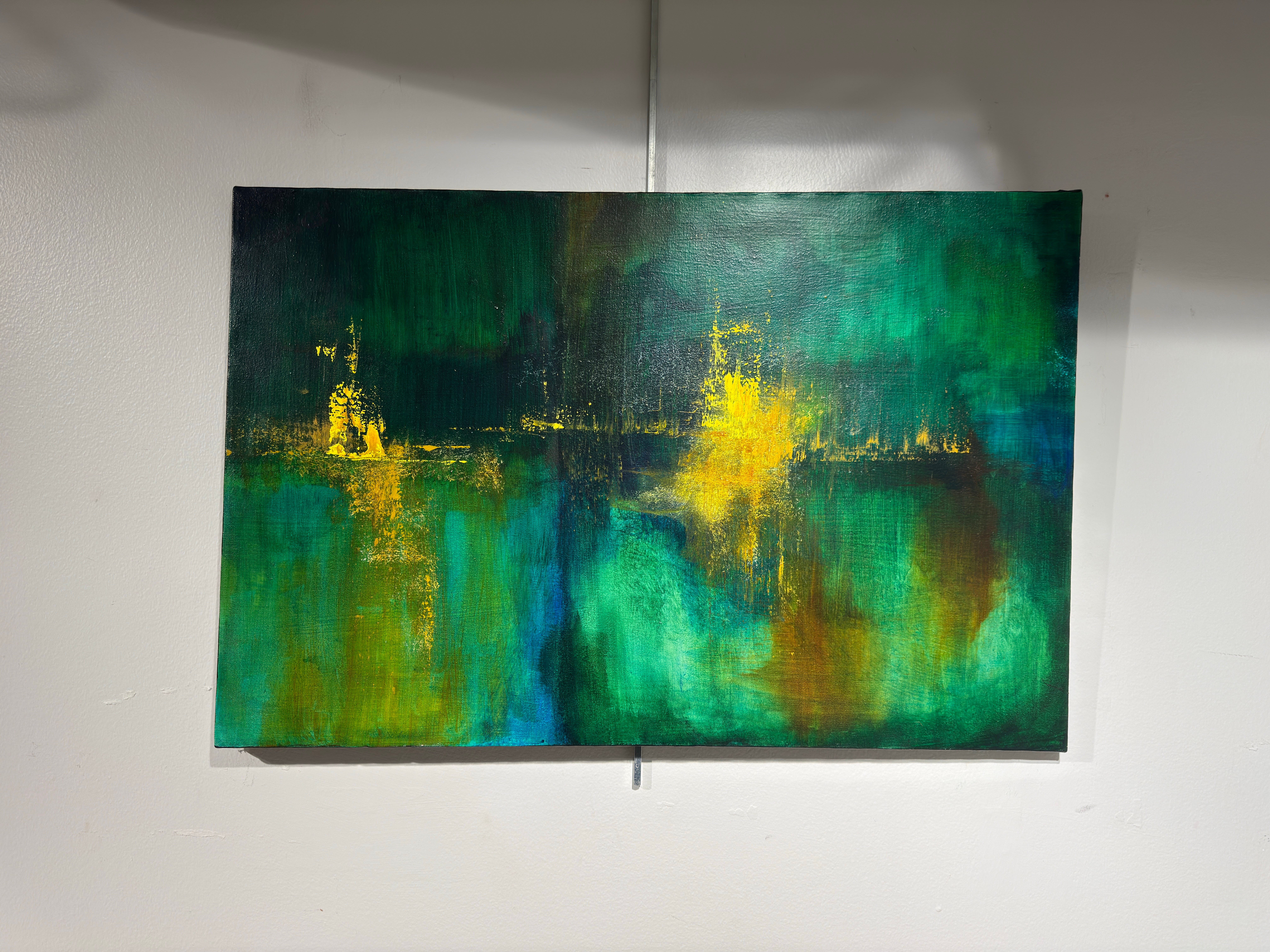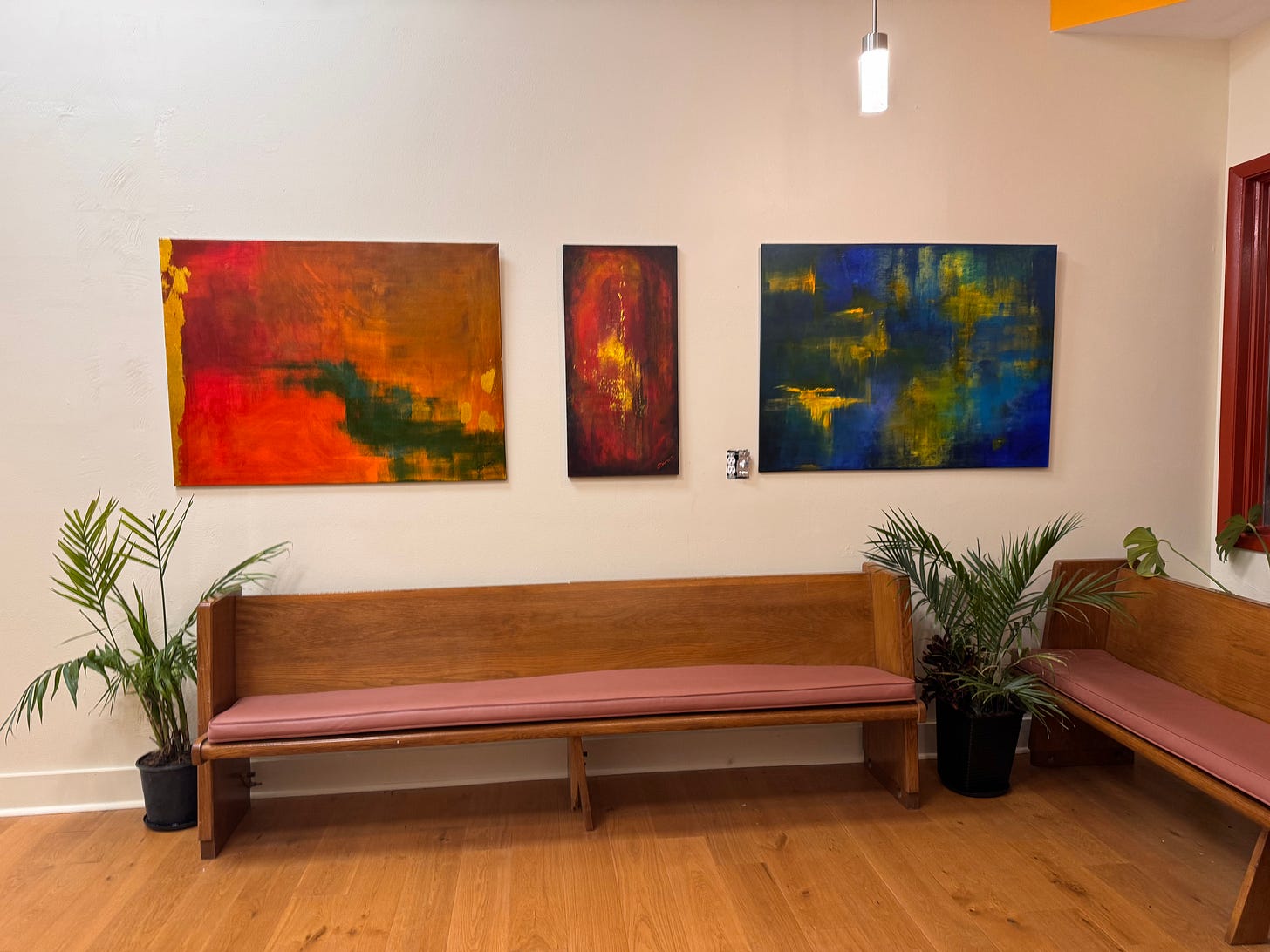 After I finished that mural I was so inspired with the idea of creating abstracts that I painted an entire series for the grand opening. These weren’t planned pieces. They emerged as echoes of the mural itself, like afterimages. I didn’t overthink them. I let them happen.